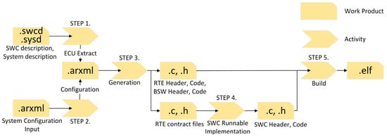 The existing AUTOSAR development methodology [,,,] has difficulty in clarifying the development process because determining the underlying tools at each development stage is not clearly defined. For commercial AUTOSAR, it is not a problem because the vendor providing the solution provides detailed manuals, but because the open source AUTOSAR does not have a clear methodology for development, there are many challenges for the developers. In this paper, a specialized procedure is proposed for development using open source AUTOSAR. The existing AUTOSAR development process has been reconfigured in five stages. The proposed procedure using ARCCORE’s open source AUTOSAR development solution is shown in Figure 3.