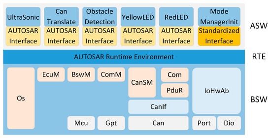 In order to provide the services that the SWC needs to perform specific functions, the modules utilized in the BSW are defined and configured. In such, the UltraSonic SWC requires timer services for measuring the return time of the Digital I/O and ultrasonic waves. CanTranslate needs the CAN communication services. As the ObstacleDetection SWC does not request any hardware resources, a BSW service is not necessary. On the other hand, hardware-related SWCs such as the YellowLED and RedLED require the Digital I/O service. The service required by ModeManagerInit is an ECU management function to perform the initialization of the ECU, timers, and communication. In addition, OS service is required for task creation and scheduling. The Com, PduR, CanIf, and Can modules are used to implement the CAN communication stack [,]. The CanSM module is used to implement the control flow of the CAN BUS. The Dio, Port, and IoHwAb modules for Digital I/O control are used; the Gpt module for timer control is used; the EcuM, BswM, Mcu, and EcuC modules are used for system management; and the Os module is used to manage the creation and scheduling of AUTOSAR tasks. Figure 5 shows the layered structure of the collision warning system after performing SWC and BSW configurations.