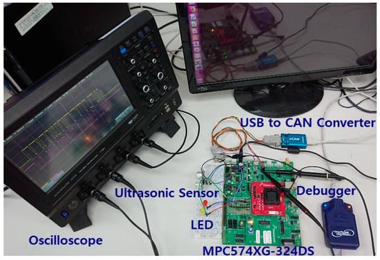 In our developed system, we used the MPC574XG-324DS board with MPC5748G MCU as the ECU. The USB Multilink Universal debug probe is used for debugging and software upload. The USB to CAN converter is used for communication between a PC and the ECU through CAN protocol. The data transferred to the PC are visualized using the tool, V-REP [,]. Ultrasonic sensors are used to measure the distances from obstacles in the collision warning system. Red and yellow LEDs inform the user about the risk of the obstacles. An oscilloscope is used to identify the CAN message frames. The complete hardware environment is shown in Figure 6.