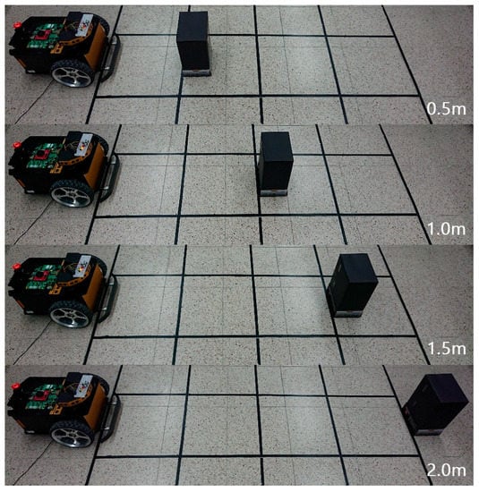 In order to verify the operation of the collision warning system in a real environment, the change of the LED was observed while moving the distance of an obstacle from 0.5 to 2.0 m. The red LED turns on when the distance from the obstacle is less than 1.0 m, the yellow LED lights up when it is between 1.0 m and less than 2.0 m, and both LEDs remain off if the obstacle is more than 2.0 m away. The test results are shown in Figure 7, showing the distance of the obstacle from the collision warning system in 0.5 m increments. The size of one block of the tile is 0.5 m in width and 0.5 m in height. Through these results, we have verified the normal operation of the collision warning system.