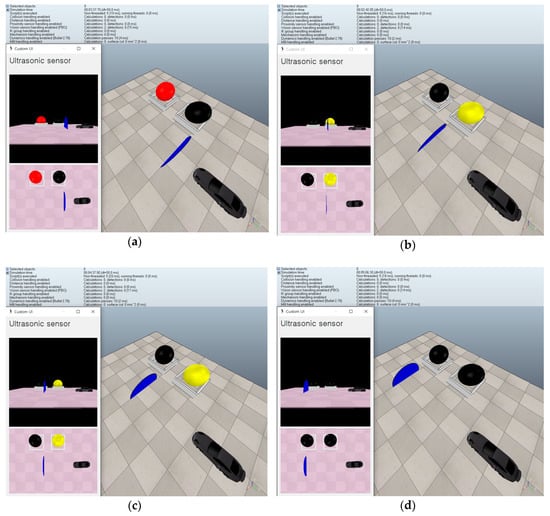 In this section, V-REP visualization is performed to visually confirm the operation of the collision warning system and the data of the ultrasonic sensor as described in the previous subsection. Figure 8 shows the result of the visualization of ultrasonic sensor data sent from ECU to CAN bus using V-REP of host PC using USB to CAN Converter. To maintain consistency with the actual experiment environment, the size of one block of tile was set to 0.5 m for both width and height. The ultrasonic sensor was attached to the front part of the vehicle, and the position of the obstacle is indicated by a blue disk. The LEDs to indicate the risk of the obstacles were composed of the same red and yellow as the actual hardware configuration. The UI on the left shows the data of the ultrasonic sensor, and the view from the side, and the view from above. We confirmed that the movement of the blue disc and the state of the LED change according to the distance between the ECU and the obstacle. The results show the same behavior with the actual experiment in the previous section.