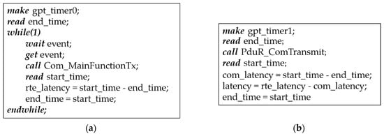 Pseudo code for measuring the latency of communication stack: (a) from Com module to Driver module; (b) from PduR module to Driver module.