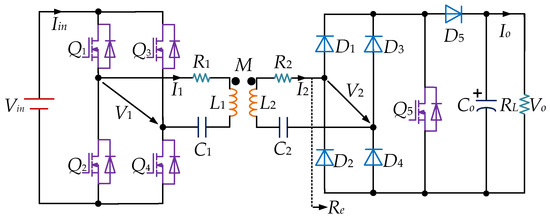 The schematic diagram of the proposed SWIPT system is shown in Figure 1, Vin is the input voltage source, and the Q1~Q4 constitute the active bridge at the primary side. The controllable switch Q5 and diode D5 are connected between the bridge rectifiers and the load at the secondary side, the switch Q5 implements chopper control at the secondary side. The L1, L2, C1, C2, R1, and R2 are the coil inductance, compensation capacitance and resistance, respectively; the subscript 1 and 2 denote the primary and secondary side. RL is the load resistance, Vo is the load voltage. The capacitance Co keeps load voltage stable. R e is the equivalent load of the secondary side.