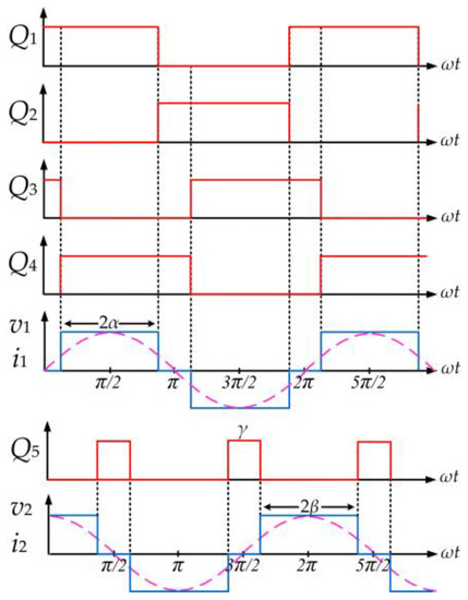 The typical waveforms of transmitter and receiver are shown in Figure 2, where the blue line indicates voltage, the carmine dotted line is current, 2α and 2β present the voltage angle of V1 and V2, respectively. The frequency of Q5 is two times the power frequency, and the voltage angle of V2 is regulated by controlling the pulse width γ. Due to resonance, the primary and secondary circuits are resistive, i.e. V1 and I1, V2 and I2 are in phase, and V2 leads V1 90° degrees. The relationship between α, γ and the load voltage Vo is obtained through the following analysis.
