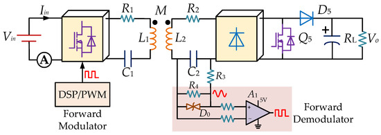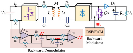 When the frequency of Q5 is lower than the power frequency, the feedback control of the secondary side is adopted to keep the load voltage stable. If the Q5 is turned off, the system load is RL, the transmission power is at a high level; if the Q5 is turned on, the load is shorted, the transmission power is reduced. Due to the power change of system caused by Q5 turn-on and turn-off in the low frequency state, the input current Iin also changes at the same frequency as that of Q5. Therefore, the backward information could be demodulated from the input current Iin. The structure diagram of information backward transmission is shown in Figure 6.
