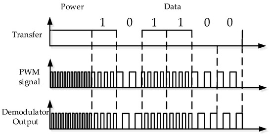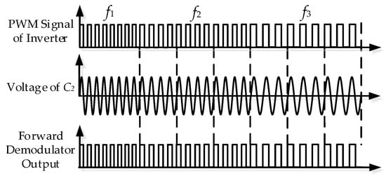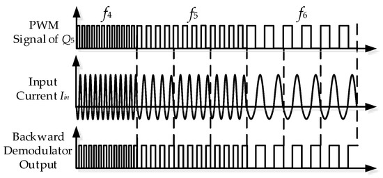 According to the analysis above, the data information could be transferred by the binary signals. Taking data backward transmission as an example, the modulation waveforms are shown in Figure 9. The switching frequency of Q5 is set to two different frequencies that represent 1 or 0 signal. The input current frequency of the primary DC voltage source changes as the same frequency as Q5. The rectangular wave signals with two different frequencies are demodulated at the primary, and the 1 or 0 signals are identified by the DSP controller of the primary side.