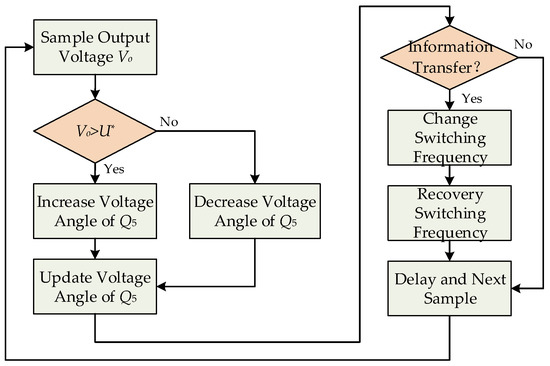 When the proposed SWIPT system is operating, the converter is controlled to keep the load voltage stable as the information is transferring. The control algorithm of the proposed SWIPT system is shown in Figure 10. In power transmission, the load voltage is sampled and compared with the reference value of output voltage. The voltage angle of the Q5 is adjusted in real time to stabilize the output voltage. When transmitting information, the frequency of the control signal is adjusted according to the transmitted signal, the switching frequency of the converter is adjusted during information forward transmission. The switching frequency of Q5 is adjusted during information backward transmission. After the information transmission is completed, the system frequency is returned to the original frequency.