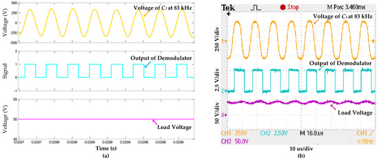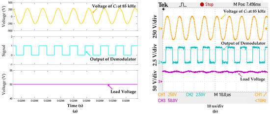 The simulation and experimental waveforms of power transmission at 85 kHz are shown in Figure 12. The simulation and experimental waveforms are the voltage of Cs, output of forward demodulator and load voltage in turn. The power frequency is set to 85 kHz, and the voltage frequency of Cs is also 85 kHz. The rectangular wave signal whose frequency is consistent with the power frequency is obtained by forward demodulator. At this time, the load voltage is maintained at 50 V due to the feedback control of secondary side.