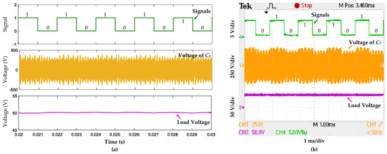 When the power frequency deviates from the resonant frequency, it can be used as the transmission instruction for predefined mode. For example, the power transmission frequency is changed to 83 kHz, then the voltage frequency of the Cs is also changed. The rectangular wave of 83 kHz frequency is obtained by forward demodulator, and the predefined instruction transmission from the primary side to the secondary side is completed. When the power frequency deviates from the resonant frequency, the feedback control of secondary side can keep the load voltage constant at 50 V. The simulation and experimental waveforms of power transmission at 83 kHz are shown in Figure 13. The simulation and experimental waveforms are the voltage of Cs, output of forward demodulator and load voltage in turn.