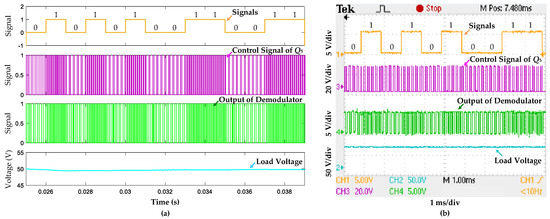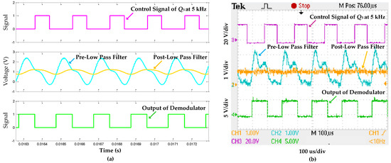 The Q5 frequency is set to 5 kHz, the frequency of input current Iin changes as the same frequency as Q5. The rectangular wave of 5 kHz frequency is obtained by backward demodulator, and the predefined instruction transmission from the secondary side to primary side is completed. When the Q5 frequency changes, the feedback control of secondary side keeps the load voltage constant at 50 V. The simulation and experimental waveforms of Q5 frequency at 5 kHz are shown in Figure 15. The waveforms are the control signal of Q5, output of pre-low pass filter and post-low pass filter, output of backward demodulator, respectively.
