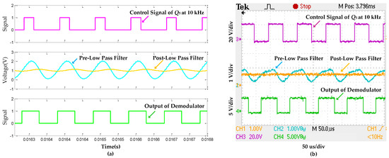 The simulation and experimental waveforms of Q5 frequency at 10 kHz are shown in Figure 16. The waveforms include the control signal of Q5, output of pre-low pass filter and post-low pass filter, output of backward demodulator, respectively. The Q5 frequency is set to 10kHz, the input current Iin changes at the same frequency. By comparing the output of the pre-low pass filter and the post-low pass filter, the rectangular wave with the 10 kHz frequency is obtained.