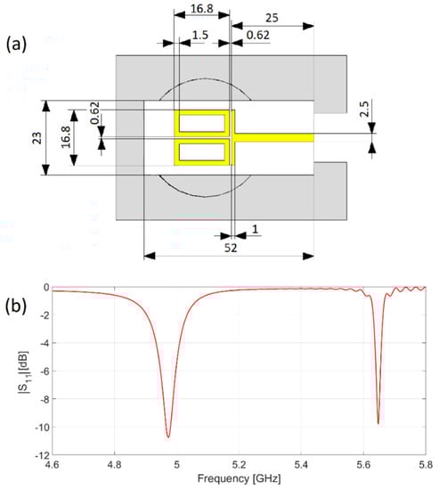 (a) Sketch of the top layer of the proposed sensor (all the geometrical parameters are in mm). (b) Modulus of the simulated scattering parameter |S11| of the sensor in air, supported by the PLA (polylactide) support (grey area) in the frequency range of interest.