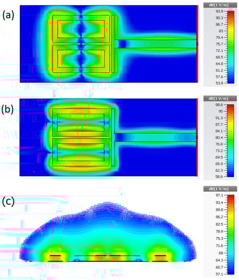 Firstly, the gap between the T-structure of the feed line and the rectangular rings and the gap between the rectangular rings, along with the position of the Petri dish on the top layer of the sensor were optimized in order to improve the overlap between the oil sample and the electric field. In particular, the position of the Petri dish was chosen so that the oil sample is located in the region of maximum field concentration of the sensor. It was found that the optimal position is achieved when the center of the Petri dish is located at 34 mm from the feeding port. Then, the Petri dish was fixed in the optimal position. For this purpose, a support made of polylactide (PLA) plastic with permittivity of 3.5 was considered (grey region in Figure 1a). Figure 1b depicts the modulus of the simulated scattering parameter |S11| of the optimized configuration, in the frequency range of interest, which shows two resonant dips. The electric field distribution at the first resonance frequency, equal to 4.958 GHz is shown in Figure 2a, while the electric field distribution at the second resonance frequency, located at 5.652 GHz is shown in Figure 2b. The cross-section of the electric field in the middle of rectangles at the second resonance frequency is presented in Figure 2c. The amplitudes of the first and second resonance dips are −10.8 dB and −9.8 dB, respectively; the full widths at half minima (FWHMs) are 32.8 MHz and 11.9 MHz, respectively; the Q-factors are 151 and 572, respectively. Hereinafter, we will consider only the second dip, since it has significantly higher Q-factor and sensitivity (frequency shift per permittivity unit). This is justified by the total electric field distribution that is concentrated in the center of the sensor (i.e., across the gap between the coupled rings), as shown in Figure 2b.