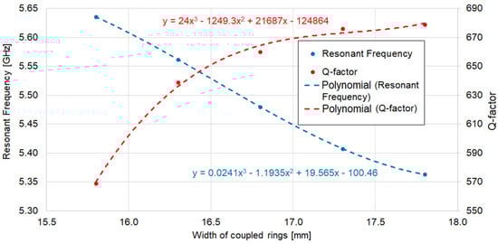 Influence of the coupled rings width on the resonant frequency and Q-factor.