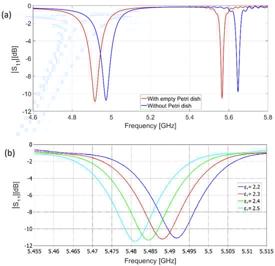 Modulus of the simulated scattering parameter |S11| of the sensor in the frequency range of interest with (a) empty Petri dish (red line) and no Petri dish (blue line), and (b) filled Petri dish at various permittivity εr of the substance. In both cases, the Petri dish is located in the optimal position.