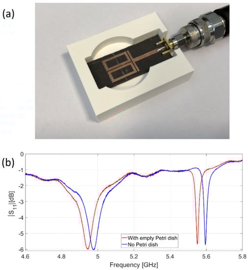 In order to validate the numerical predictions, we fabricated the proposed microwave sensor by means of the Printed Circuit Board (PCB) prototyping system LPKF ProtoLaser U3 (PLU3). The PLU3 is based on a frequency-tripled Nd:YAG diode laser emitting at 355 nm, used for copper etching. The PLU3 has a resolution of 2 μm, which is very suitable for fabricating microwave devices. The plastic support was manufactured in PLA using 3D printing technology to accommodate the plastic dishes with a 35 mm diameter. Figure 5a illustrates the experimental setup with the fabricated sensor, while the modulus of the scattering parameter |S11| of the sensor with and without an empty Petri dish is shown in Figure 5b. The measured |S11| spectrum shown in Figure 5b is in excellent agreement with the simulated |S11| spectrum shown in Figure 4a, the difference between the two |S11| plots is in the order of few MHz.