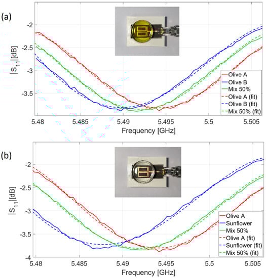 To measure and determine the sensitivity of the fabricated sensor, two types of extra-virgin olive oil and one type of sunflower oil were considered, and measurements of single oils and their mixture (at a concentration of 50%/50%) were carried out. Figure 6a shows the frequency shift of the measured |S11| spectrum of the sensor when the Petri dish is filled with 8 mm level of sample liquids, namely the two types of extra-virgin olive oils (A and B) and their 50/50 mixture. It is worth stressing that we used the same plastic Petri dish for all the measurements. The solid lines refer to the experimental data acquired by means of a Vector Network Analyzer (VNA, Agilent Technologies N9917A) in the frequency range 5.479–5.506 GHz. The experimental data were fitted by means of a MATLAB script that implements a 4th-order polynomial function, in order to define the minima. Figure 6b shows the frequency shift of the measured |S11| spectrum of the sensor when the Petri dish is filled with an 8 mm level volume sample of the extra-virgin olive oil A, the sunflower oil, and their 50/50 mixture. Also in this case, the experimental curves were fitted by means of a 4th-order polynomial function, to find the minima. The first column of Table 2 reports the experimental minima and their comparison for the first and second measurements. We retrieved the permittivity of the single oils by considering the linear dependence of the resonant frequency, shown in Figure 4. The fitting function between dielectric constant of the tested sample and the resonant frequency (f [GHz]) is formulated as follows: εr = −23.131f + 129.38.