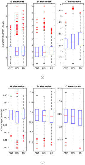 The methodology explained in Section 2 was applied to the HD-EEG database. Figure 2 displays the boxplots of the Characteristic Path Length and the Clustering Coefficient of the three groups of patients for each electrode configuration. Each boxplot is made up of 1600 parameters, 40 for each patient. Figure 2a shows that there is no clear difference of between the three groups for 18 and 64 electrodes, whereas the difference becomes evident only with the HD configuration (173 electrodes).
