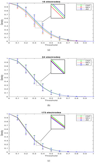 Mean values of the Connection Density (D) computed by thresholding the connectivity matrix of CNT, MCI, and AD for: (a) 18 electrodes, (b) 64 electrodes and (c) 173 electrodes. The vertical segments represent the standard deviation of D.