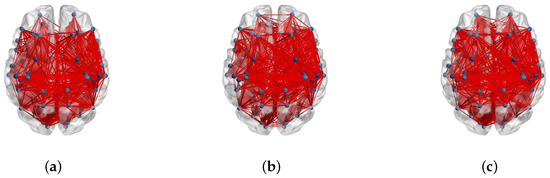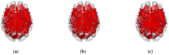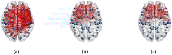 Connections between ROIs for 18 electrodes of: (a) CNT, (b) MCI and (c) AD.
