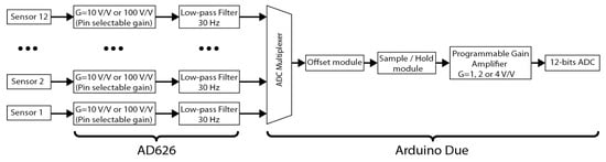 In the case of the twelve-channel prototype, if we followed the previous scheme, Arduino Due would have to feed the twelve conditioning circuits and the Clock and SD shields. That supposes four times higher demand of current with respect to the three-channel system. Therefore, we have opted for an external power supply, concretely a typically common 12 V battery. The Arduino Due is directly connected to the 12 V through the barrel jack connector. It converts this voltage into 3.3 V for internal use and for the SD shield. The 12 V battery is also connected to a fixed DC/DC module [] that provides 3.3 V to the twelve conditioning circuits and the Clock shield. The use of this battery is not mandatory; we have selected it because is the battery usually used the most in this type of systems. Input voltage recommended for Arduino Due board is in the range of 7–12 V and for DC/DC module is in the range of 6–28V. Thus, any battery between 7 and 12 V could be used, even a power bank that is usually used to charge mobile phones could be used. Our experience with a 12 V 4.0 AH (amp hour) full charged battery is that the system could be recording in continuous mode around 130 hours (i.e., more than 5 days).