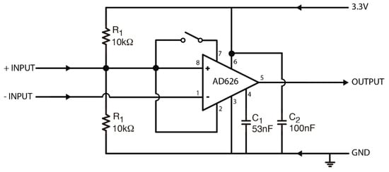 Figure 2 shows the circuit designed for the acquisition of the seismic noise. The signal provided by the sensor, i.e., the input signal, is a differential signal that swings between negative and positive values. With the AD626 working in single power supply mode, the negative signal would be cropped if the input signals were directly connected to the amplifier. In order to avoid this, an offset voltage is added to the input signal using a voltage divider. To allow the maximum possible swing of the signal, the offset has to be set up just in the middle of the input voltage range, between ground and the power supply, 3.3 V. For that, two equal resistances connected between 0 and 3.3 V will be enough to provide in the middle point the required 3.3/2 V. In our case, we have selected two resistances of 10 kΩ (with 0.1% of tolerance) as a compromise value. The parallel of these resistances with the internal resistance of the sensor (i.e., 5500 Ω for the Mark-L-4C3D and Mark-L-4C sensors []) has to be much lower than the internal resistance of the amplifier (200 kΩ). At the same time, the power consumed by these two resistances in series has to be as lower as possible.