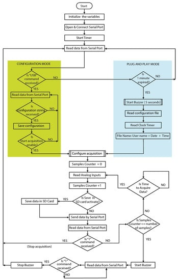 Once the Arduino Due board is powered on, the sketch starts running. Firstly, the program variables are initialized and the serial port is opened. In this stage, two operation modes are possible: configuration, and plug and play modes, which are indicated in Figure 4 with green and blue shadows, respectively.