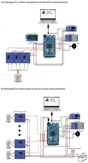 Figure 5 shows in detail the different blocks that compose the hardware system, as well as the different connections among them. Two different prototypes are presented, for three and twelve channels. The three-channel prototype is used for H/V measurements, where only one three-component sensor is needed. The twelve-channel prototype is used for array measurements, where several vertical sensors register seismic noise simultaneously.