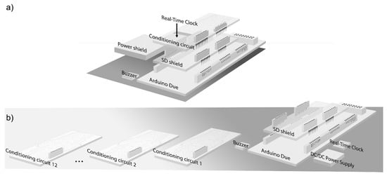 Arrangement of the different hardware modules for both prototypes, with (a) three channels and (b) twelve channels.