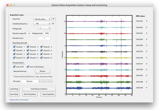 Although the system has been designed for the acquisition of seismic noise, its application can be extended to other areas that also require recording different analog signals simultaneously from several sensors. For example, in the field of seismic risk, it can be also used for the monitorization of the buildings’ structural health [,,]