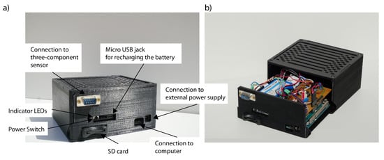 - Soler-Llorens, J.L.; Galiana-Merino, J.J.; Giner-Caturla, J.; Jauregui-Eslava, P.; Rosa-Cintas, S.; Rosa-Herranz, J. Development and programming of Geophonino: A low cost Arduino-based seismic recorder for vertical geophones. Comput. Geosci. 2016, 94, 1–10. [Google Scholar] [CrossRef]