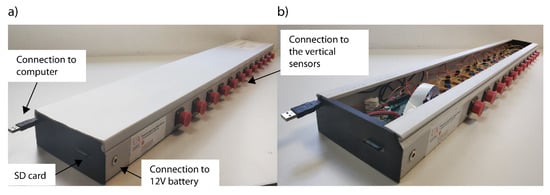In this section, the two prototypes developed for seismic noise measurements are presented. For the recording of the seismic signals, short-period sensors, with a corner frequency of 1 Hz, were used. For the application of the H/V analysis, we used a three-component 1 Hz sensor (Mark-L-4C3D). This sensor records soil vibrations in the vertical, North–South, and East–West directions. For the array measurements, we used twelve vertical 1 Hz sensors (Mark-L-4C) recording seismic noise simultaneously. The sensitivity of these sensors is 270 V/m/s []. They only have to be set down directly on the ground, whenever it is possible, avoiding soft grounds (mud, ploughed soil, tall grass, etc.) and steep slopes. Additional recommendations about the experimental conditions can be found in the SESAME report [].