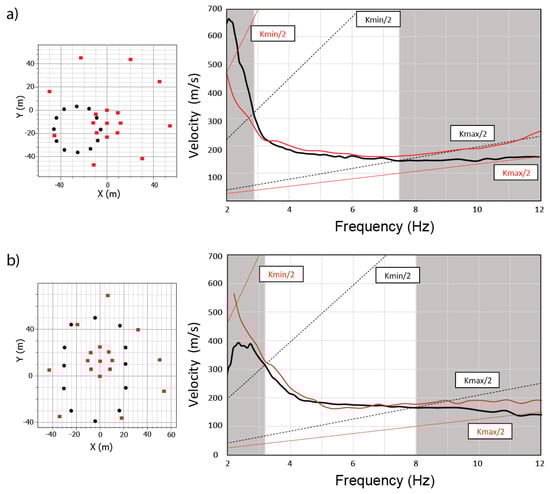 Array geometries (left column) and estimated dispersion curves (right column) for the developed data acquisition system (black color) and the commercial equipment (red color), for the sites under study: (a) Almoradí, and (b) Rojales. Wavenumber limits (kmax/2 and kmin/2) are represented with dashed lines in the corresponding color.