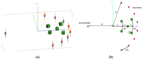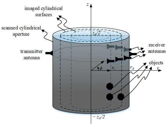 The container including the objects is scanned by the transmitter and receiver antennas over a cylindrical aperture. At each longitudinal position
