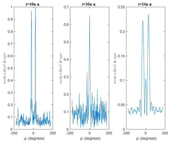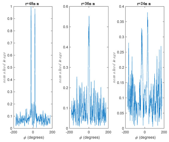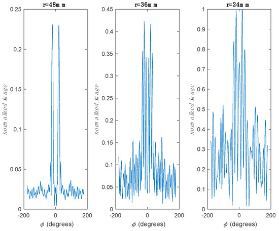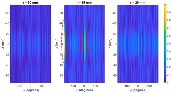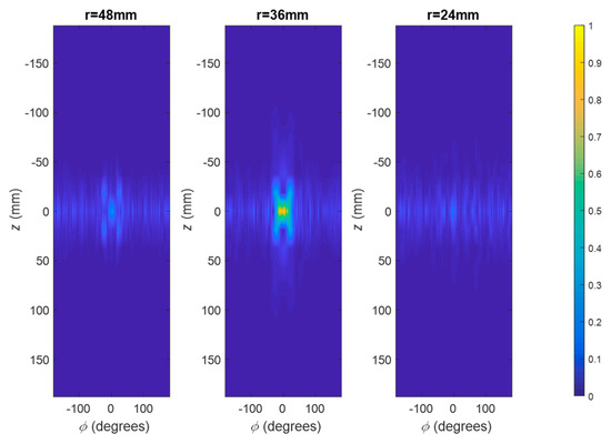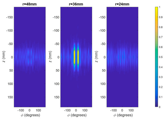 Figure 18 shows the reconstructed images over the three cylindrical surfaces for this case. Again, it is observed that the two objects on the middle surface can be reconstructed well at their true positions of