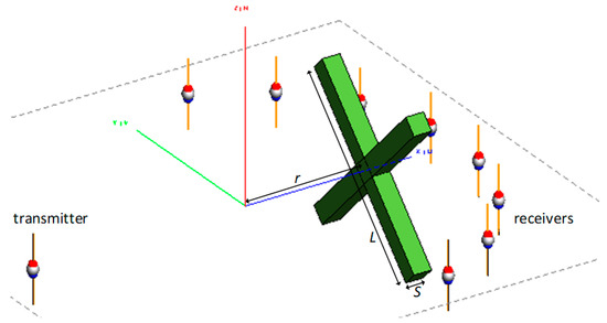 . We use the reconstruction error parameter defined in Equation (8) to evaluate the quality of image reconstruction. The computed reconstruction error for this experiment is 20.84. Comparing the reconstruction error parameter with the previous example, we observe the degradation of the image quality. This is mainly due to the fact that the background medium is lossy, and the responses of the objects are weaker for the objects on the surface