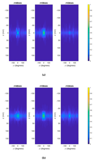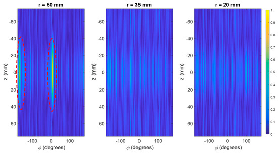 These systems of equations are solved at each spatial frequency pair to obtain the values for , . Then, inverse DTFT along longitudinal direction and inverse DFT along azimuthal direction can be applied to reconstruct images over all cylindrical surfaces , . At the end, the normalized modulus of , , where is the maximum of for all , is plotted versus and to obtain 2D images of the objects at all cylindrical surfaces. By putting together all 2D images, a 3D image of the objects is obtained. We call this process normalization of the images.