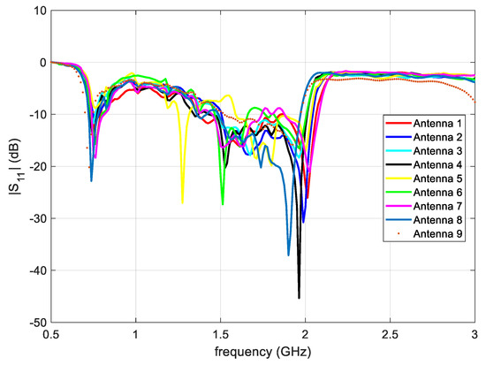 (by VNA) for the nine antennas used as transmitter and receivers. These measurements are performed while the antennas are placed in a 3D-printed holder around the liquid container. The values of