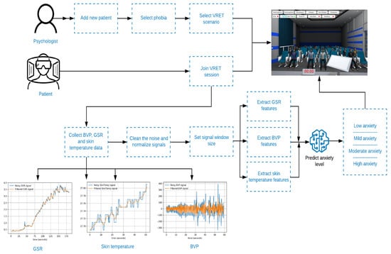 To expand our developed VRET system to have the ability to detect anxiety during therapy sessions, we implemented a mental stress prediction framework, which can be used during VRET sessions. Using this framework, we can collect GSR, BVP, and skin temperature signals, process them, extract the significant features, and finally use them to predict the anxiety level. This framework is within the bounds of our VRET system as presented in Figure 2.