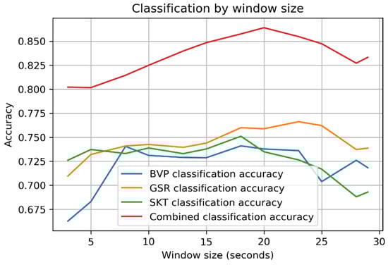 For GSR and BVP signals, the window size had a significant impact on the results, while skin temperature was less impacted by the window size. For all signals, the accuracy steadily increased as the window size increased. The peak was reached at around 18 to 23 s.