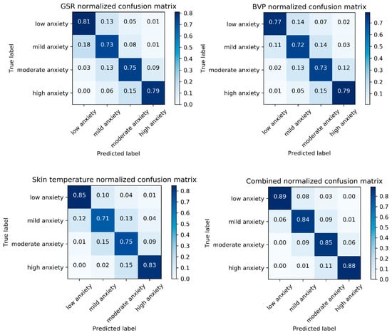 Confusion matrixes for each signal (GSR, BVP, skin temperature) and signal fusion (early).