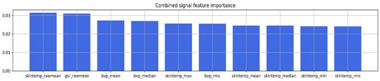 We applied random forest (RF) for feature selection. The method can expose the feature importance of a classification task using the Gini index []. This index shows a correlation between the signal feature and anxiety label. The stronger relationship is indicated by a higher index value. In the case of signal fusion, we can state that the strongest features were extracted from all signals. Interestingly, the method selected six features from skin temperature, three features from BVP, and one feature from GSR. The 10 most-impactful features of the fused signal (with the highest Gini index values) are displayed in Figure 9.