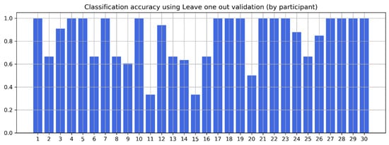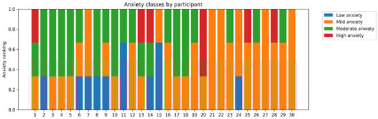 Standard k-fold validation cannot demonstrate a good validation measurement for a subject to subject basis as it mixes data from all participants into separate folds. Therefore, for a subject independent validation, it is useful to perform “one-subject-leave-out” validation. This means that in our case, we used signals of 29 participants and then tested it against one. Our signal fusion (early) model achieved an 80.1% accuracy on average with this type of validation. From Figure 10, we can see that the anxiety prediction accuracy remains high for most of the participants; however, it sharply drops for subjects 11, 15, and 20 (see Figure 10). This highlights the challenges of predicting anxiety for every subject individually as the results can be impacted by the subjective nature of the SUDS scale and challenges of the generalization of the autonomic nervous system response through psychophysiological signals (class distribution by participant is visualized in Figure 11).