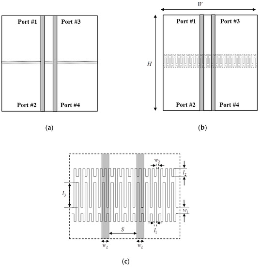 Figure 1a,b shows two PCBs containing parallel line traces (W = 100 mm, H = 100 mm, S = 10 mm, wL = 1.69 mm) on one side. On the bottom sides of the boards, a simple straight split ground plane, like a rectangular DGS [30,31], and a proposed meandered DGS (w2 = 0.2 mm, l1 = 0.25 mm, w1 = 2 mm, l3 = 20 mm, l2 = 2 mm) embedded split ground plane are formed, respectively. The dielectric material used for the PCBs is FR4 whose relative permittivity is 4.2, and the thickness of the boards is 1.0 mm. The width of the split gaps of the two boards is 2 mm. There are a total of 110 (N) meandering cells in the split in Figure 1c, which are not drawn to real scale. The characteristic impedances of the signal traces above the solid ground plane are set to be 50 Ω to eliminate reflections from the coaxial cables, which connect the board to a network analyzer.