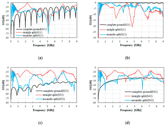 We measured the scattering parameters of the two samples with a complete homogeneous ground plane in Figure 2. As shown in the figure, the reflections occur due to the split gaps, and the scattering parameters show resonant behavior. Compared with the complete homogeneous ground plane, the two split ground planes degrade the signal integrity and increase crosstalk. However, the meander split improves the signal integrity and decreases 30 dB of crosstalk up to 9 GHz more than the straight split ground plane, like a rectangular DGS [30,31]. This difference comes from the enhanced coupling due to the meander structure on the split plane.