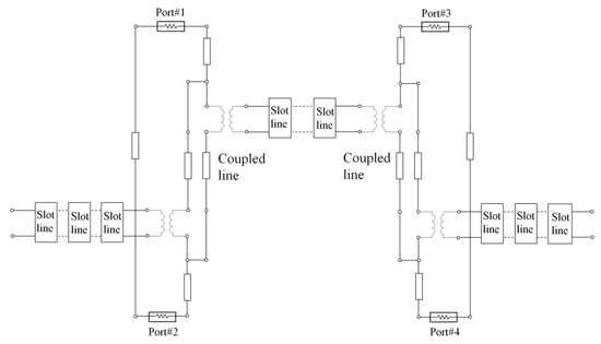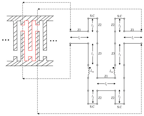 Based on the equivalent circuit of the meander gap, the crosstalk equivalent circuit of Figure 6 can be derived for the meander split on the ground plane. The split gap can be modeled by a slot line with a transformer, which is excited by the signal line above [11]. If the spatial period of the meander structure is small enough, the signal line crosses over the split gap in a number of points, which can be modeled by transformers. It shows that if a signal line crosses over the meander split gap on the ground plane, it excites a transverse electromagnetic (TEM) mode in the mender split gap, which has a structure similar to the slot lines. The excited modes propagate in either direction and are scattered at the corners of the meander line, which impede the propagating modes. The split gap right under the signal line can be regarded as a coupled line structure, of which coupling strength can be changed by varying the longitudinal length dimension of the split.