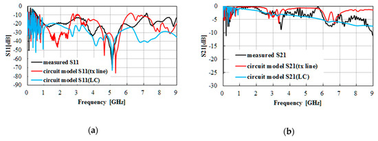 Figure 7 shows the effectiveness of the equivalent circuit of Figure 4 and Figure 5. The crosstalk behaviors of the circuit model simulated using Agilent ADS and measurement show good overall agreement about the peak and zero. At low frequencies below about 3 GHz, the LC equivalent circuit model of Figure 4 was closer to the measured result than the transmission line equivalent model of Figure 5. At high frequencies, the transmission line model was close to the measured result. The mutual inductance effect is proportional to the vertical length of the meander split and their relationship is calculated by the linear interpolation from the simulation and measured result. The crosstalk simulation result of the circuit model is slightly overestimated compared to the measured result because of the interpolation residual error of the mutual inductance value.