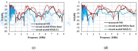 Scattering parameters of the simulation (circuit model) and measured result. (a) S11; (b) S21; (c) S31; (d) S41.