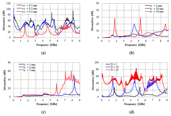 Lateral wave attenuation of the unit cell of the meander slot line obtained by Figure 4. (a) Split gap width w2 changed (when l1 = 0.25 mm, l2 = 0.4 mm, l3 = 30 mm, w1 = 2.1 mm, w2 = w3); (b) length l3 changed (when l1 = 0.25 mm, l2 = 0.4 mm, w1 = 2.1 mm, w2 = w3 = 0.2 mm); (c) length l2 changed (when l1 = 0.25 mm, l3 = 2 mm, w1 = 2.1 mm, w2 = w3 = 0.2 mm); (d) number of cells changed (when l1 = 0.25 mm, l2 = 0.4 mm, l3 = 30 mm, w1 =2.1 mm, w2 = w3 = 0.2 mm.