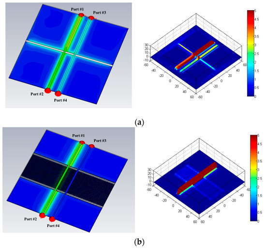 Recently, various shapes of defective ground structures (DGS) such as the “U”, “V”, “H”, rectangular, square, circular, ring and dumbbell shape [25,26,27,28] have been investigated to design the wideband filter without adding any complexity to the original structure. Some complex shapes have also been studied, which include meander lines [29]. All of these studies focus on the design of the filter using DGS, and it is necessary to study DGS for their crosstalk reduction effect. Recently, several studies [30,31] have investigated the reduction of crosstalk using rectangular or dumbbell DGS shapes on the ground plane, finding that the reduction effectiveness is 20 dB over a frequency range of 5 GHz.